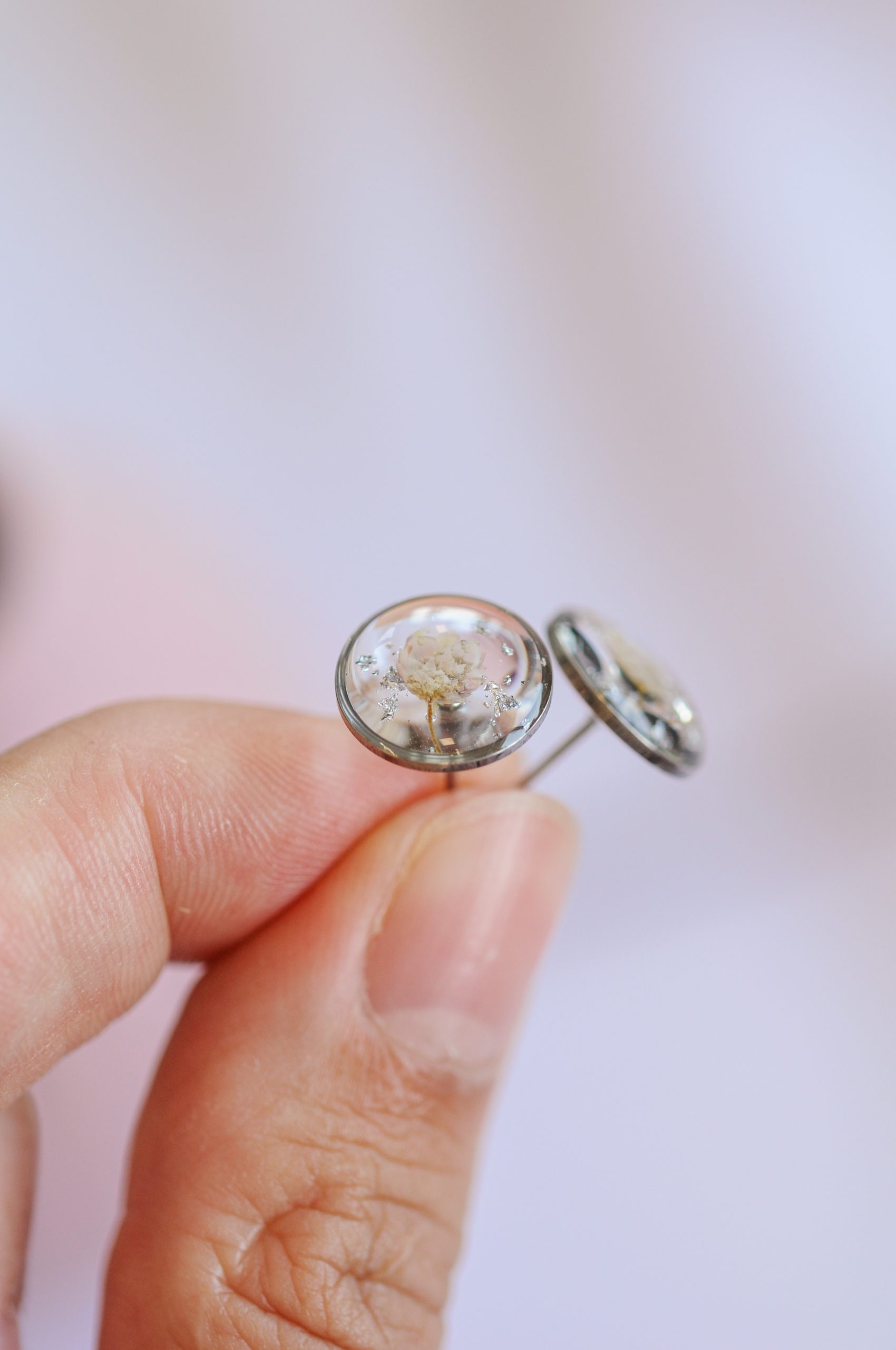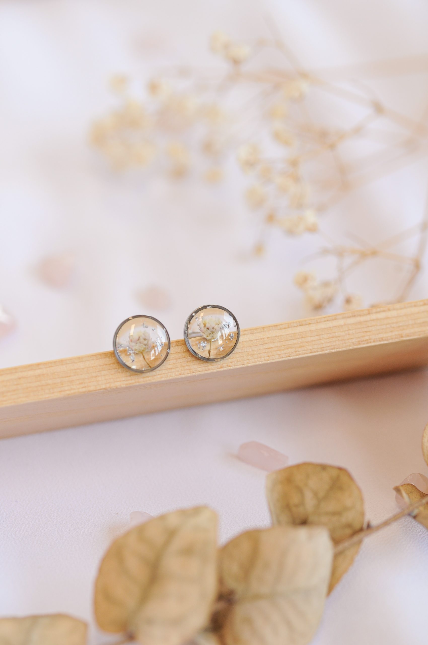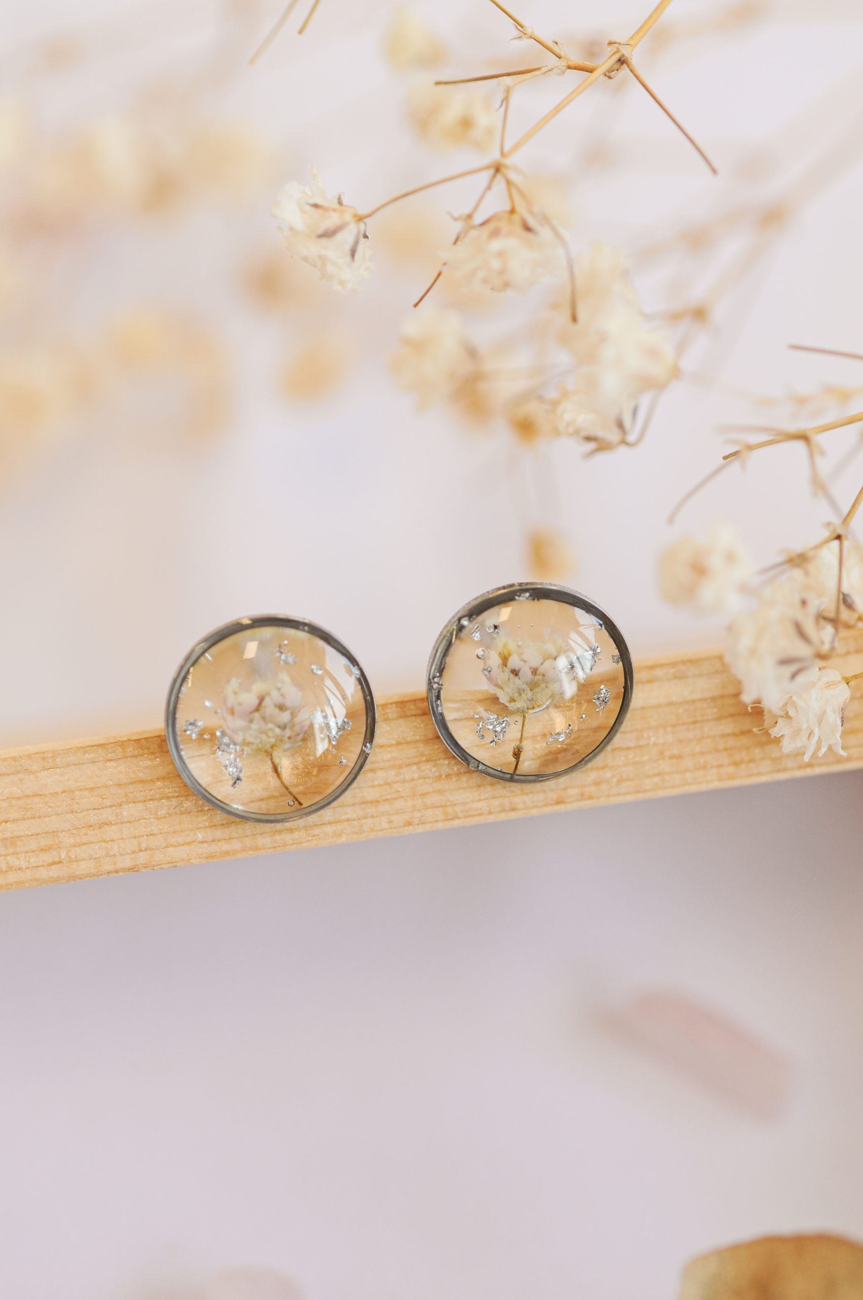 V prosojni epoksidni smoli je ujet pravi droben cvet ozothamnusa – ki prinaša življensko energijo v vaš vsakdan. Kot v naravi je vsak cvet malce drugačen, zato ima vsak par svoj poseben značaj.