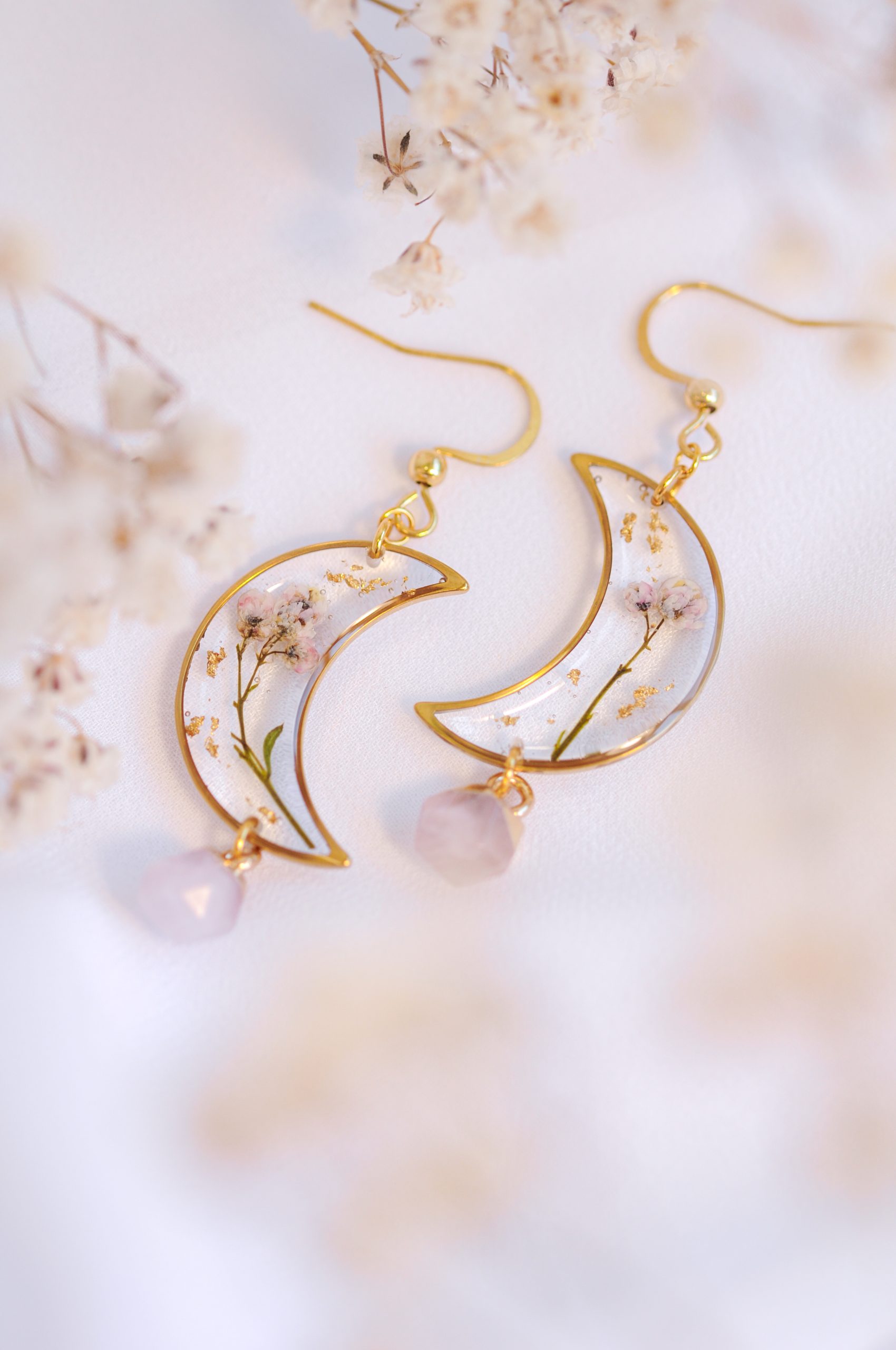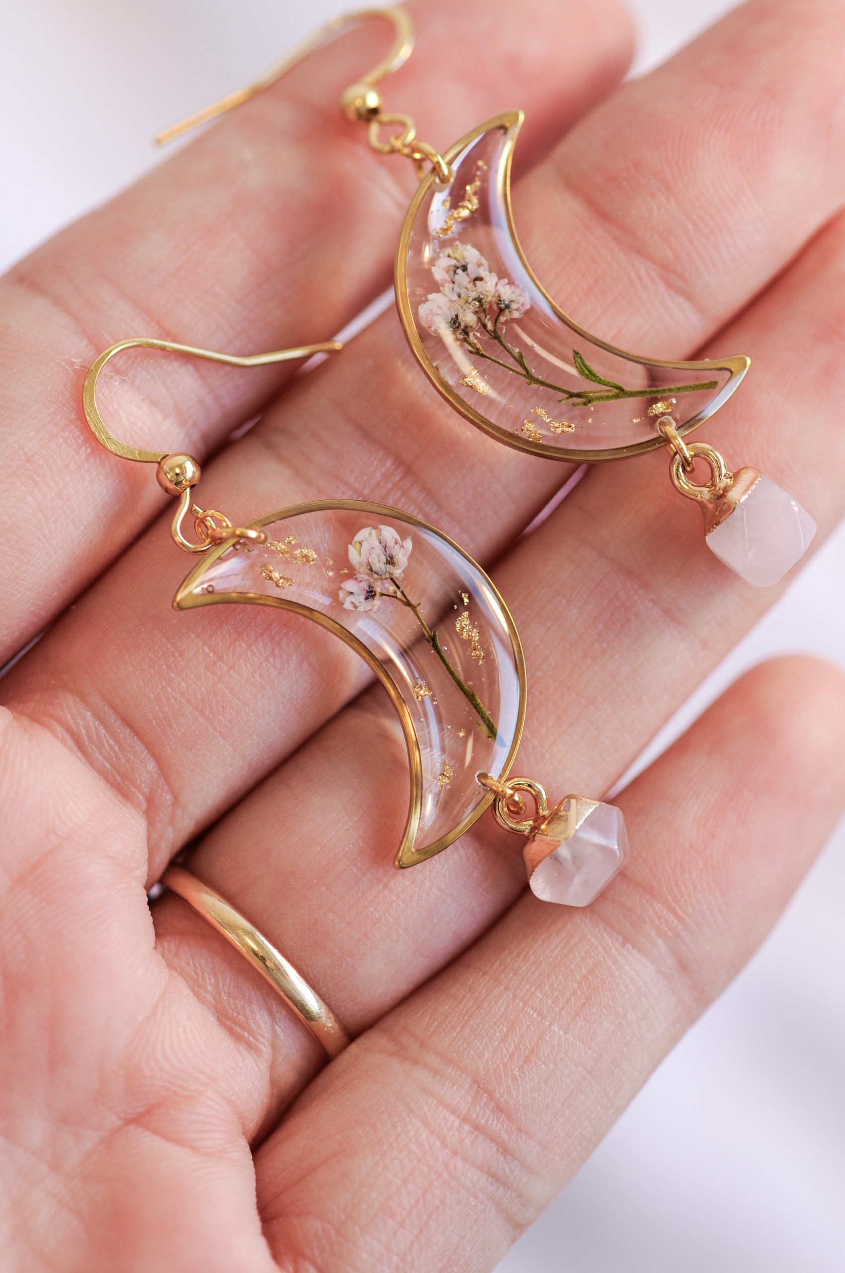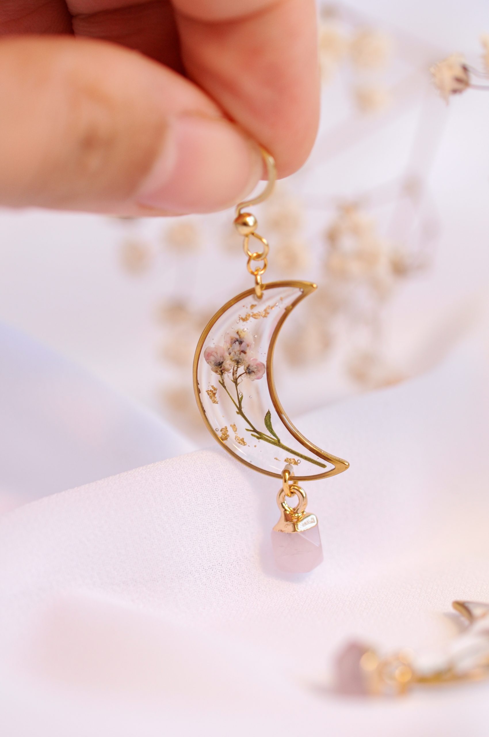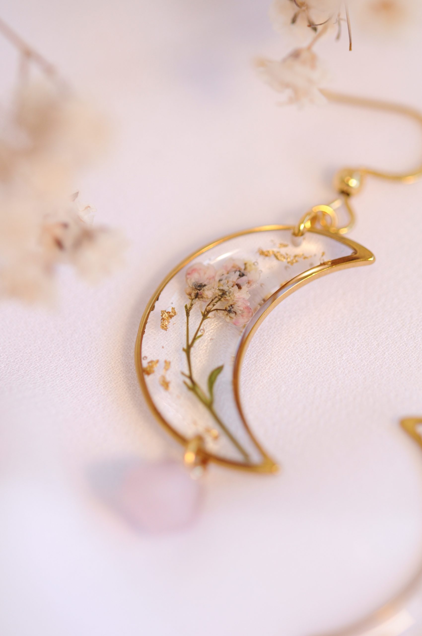 Predstavljam vam čudovite viseče uhane, ki bodo zagotovo navdušili vsako ljubiteljico narave in njene energije. Obesek, oblikovan v luno, predstavlja ženskost, nežnost in prefinjenost. V njem pa je v kritalno čisti epoksidni smoli ohranjen prava cvetoča vejica ozothamnusa, ki simbolizira edinstvenost narave in vas samih.