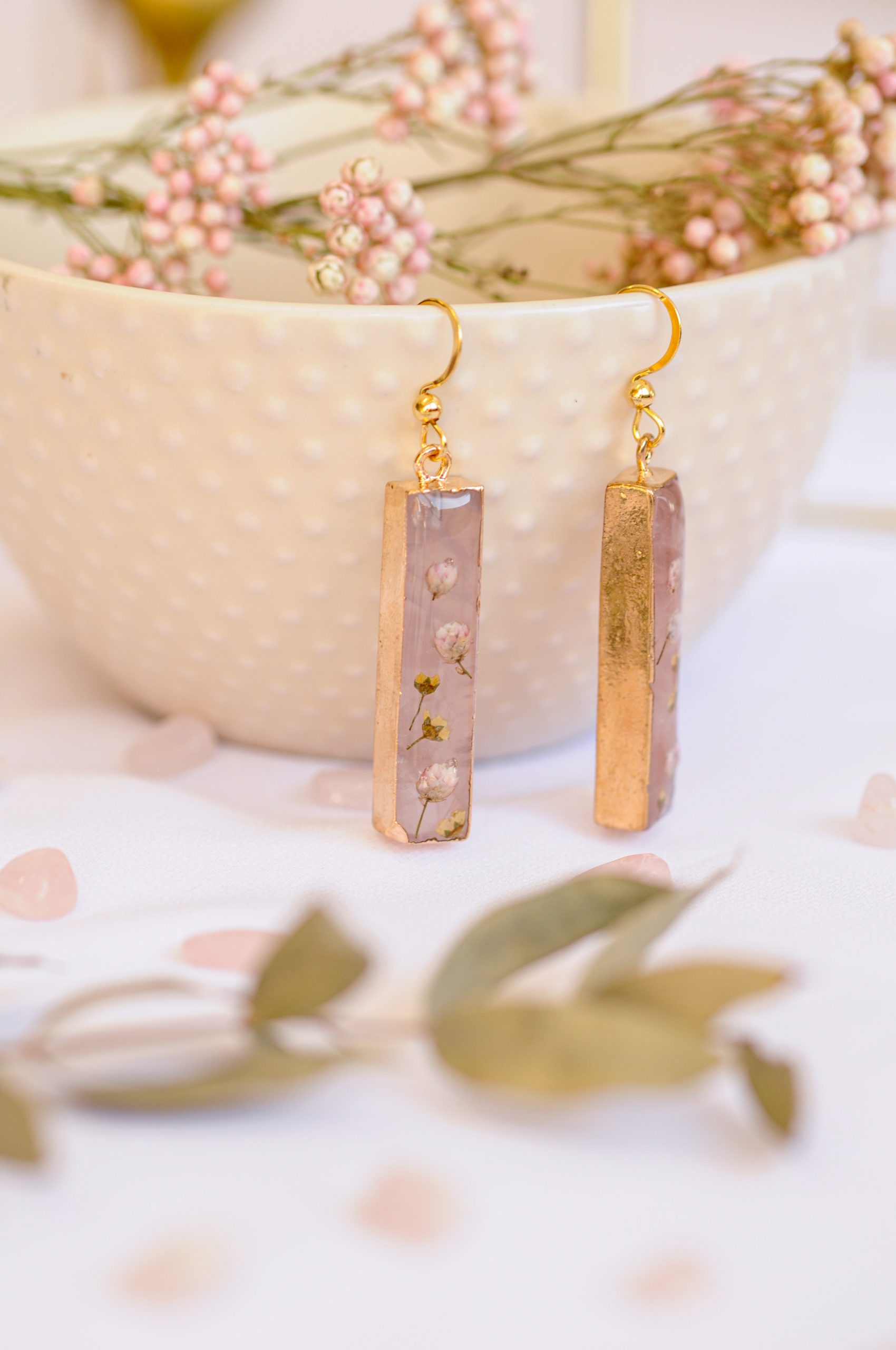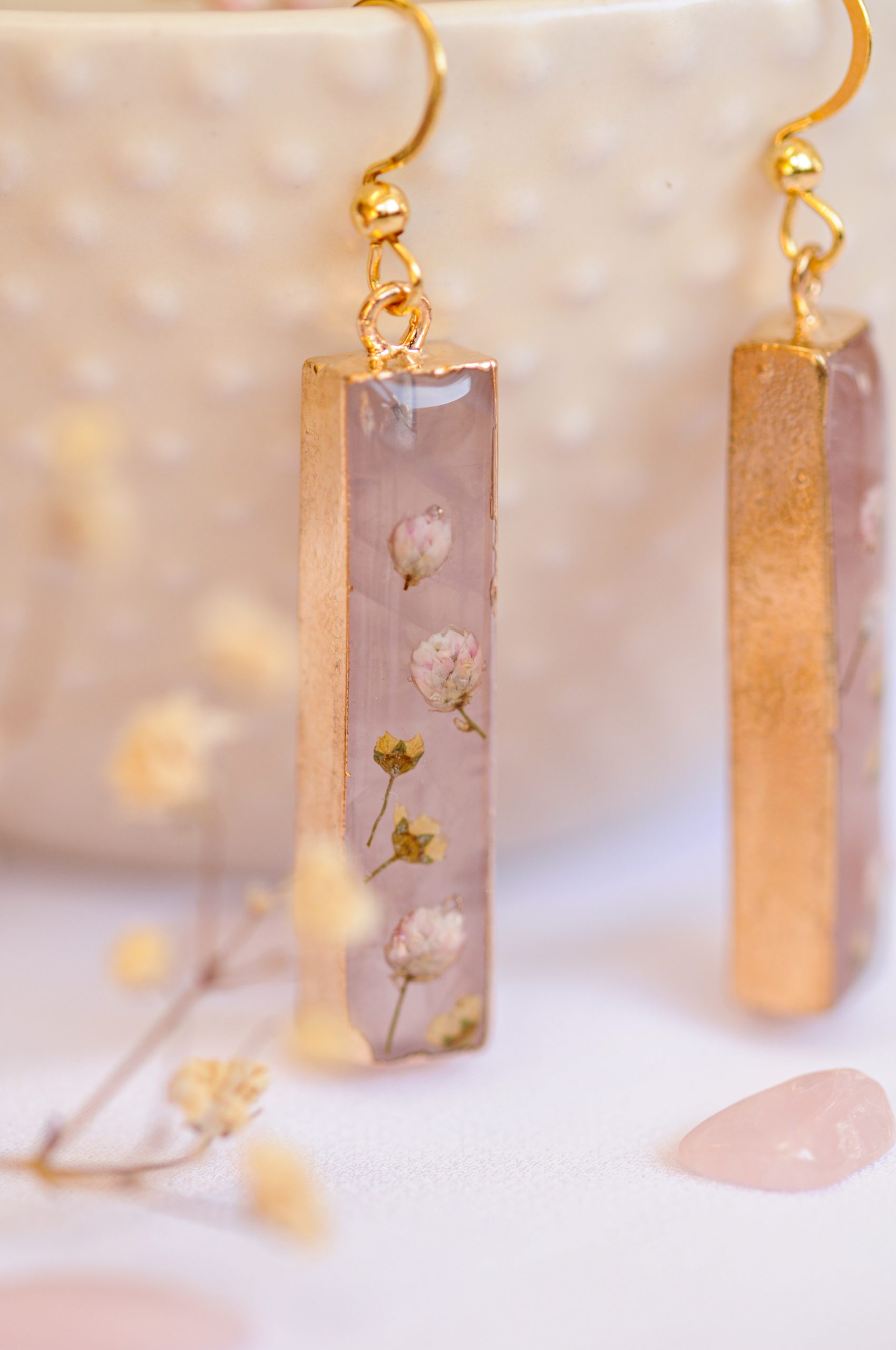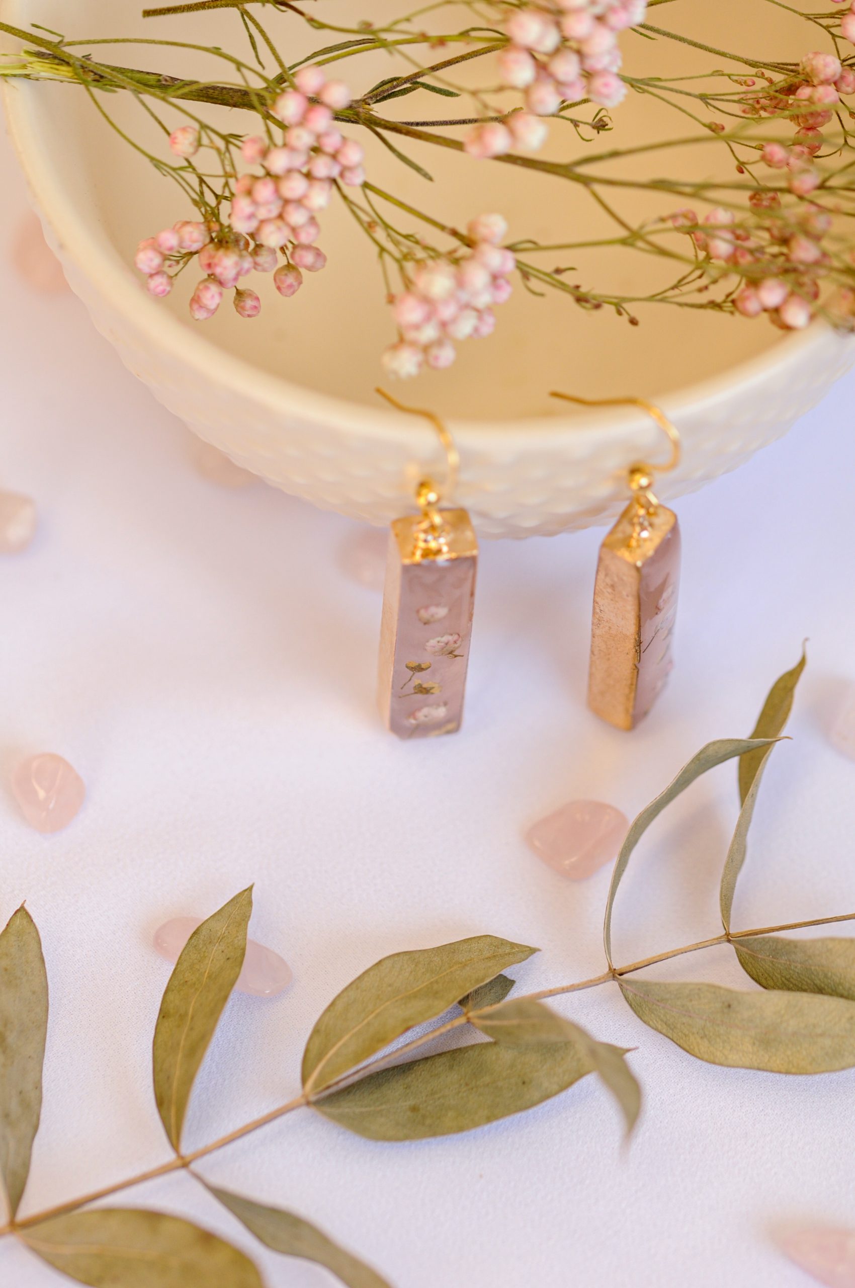 Prekrasni viseči uhani združujejo nežnost rožnega kamna in krhkost pravih cvetov v brezčasen, eleganten kos. Rožni kamen, znan kot kristal ljubezni in harmonije, s svojo mehko prosojno barvo prinaša občutek svežine, nežnosti in miline. Njegova naravna lepota se popolno dopolnjuje s skrbno izbranimi drobnimi cvetovi ozothamnusa in bele medvejke, ki so ohranjeni v kristalno čisti epoksidni smoli. Cvetovi, ki so kot zamrznjeni v času, ustvarjajo občutek krhkosti in nežne elegance, ki nikoli ne zbledi.