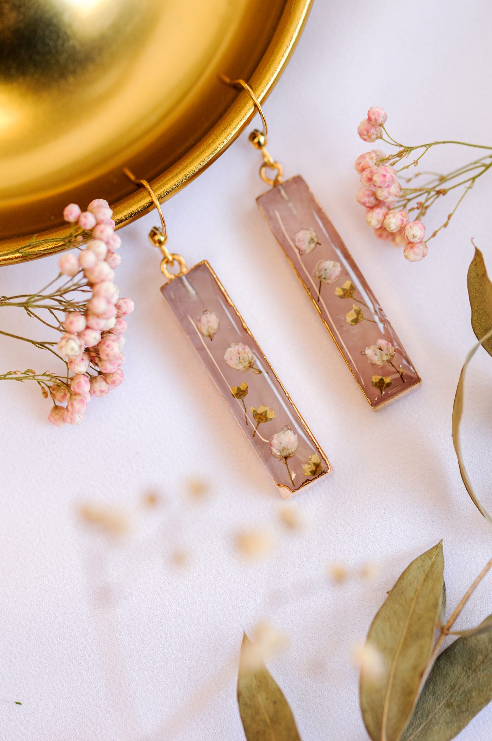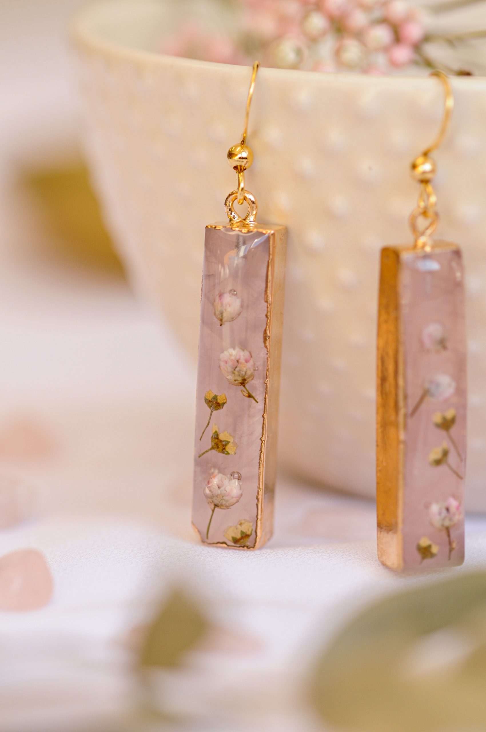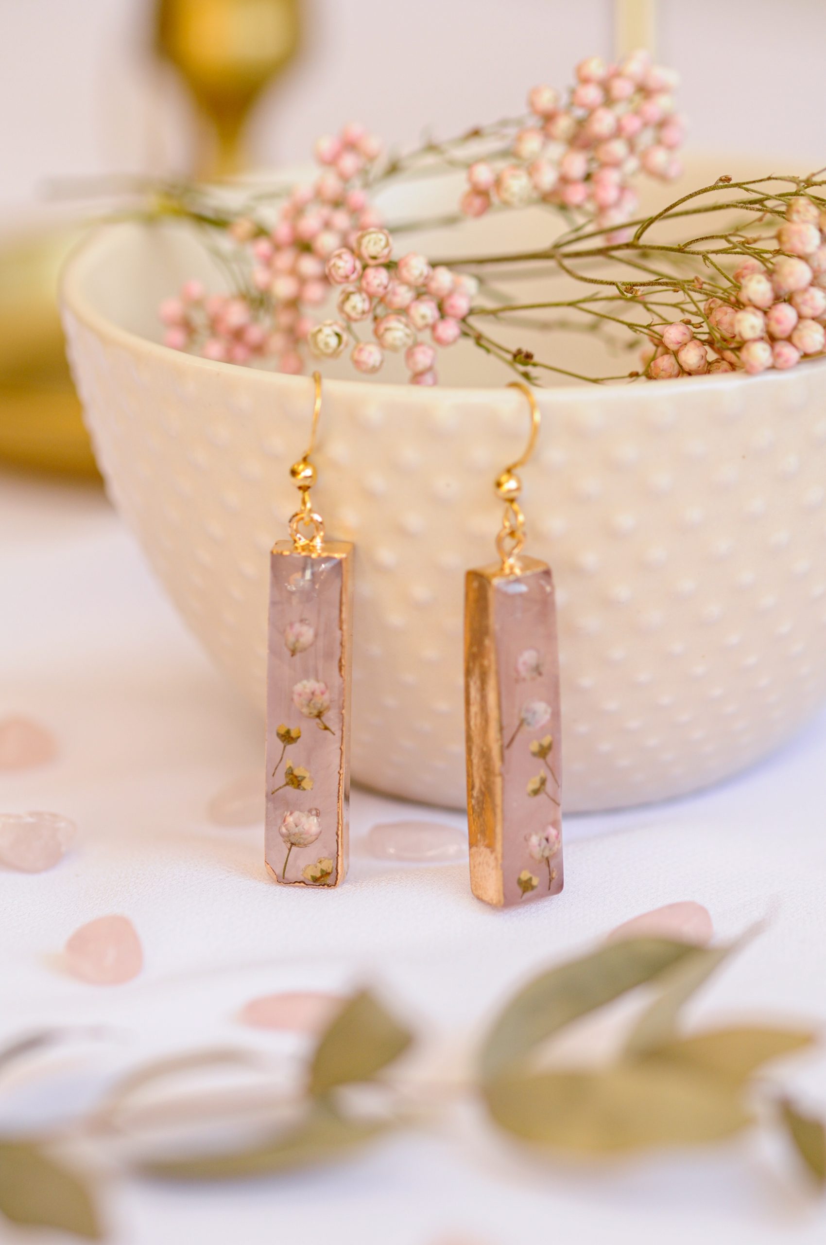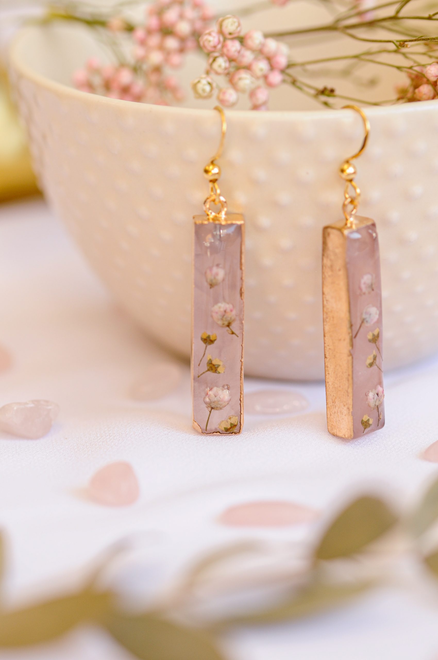 Prekrasni viseči uhani združujejo nežnost rožnega kamna in krhkost pravih cvetov v brezčasen, eleganten kos. Rožni kamen, znan kot kristal ljubezni in harmonije, s svojo mehko prosojno barvo prinaša občutek svežine, nežnosti in miline. Njegova naravna lepota se popolno dopolnjuje s skrbno izbranimi drobnimi cvetovi ozothamnusa in bele medvejke, ki so ohranjeni v kristalno čisti epoksidni smoli. Cvetovi, ki so kot zamrznjeni v času, ustvarjajo občutek krhkosti in nežne elegance, ki nikoli ne zbledi.